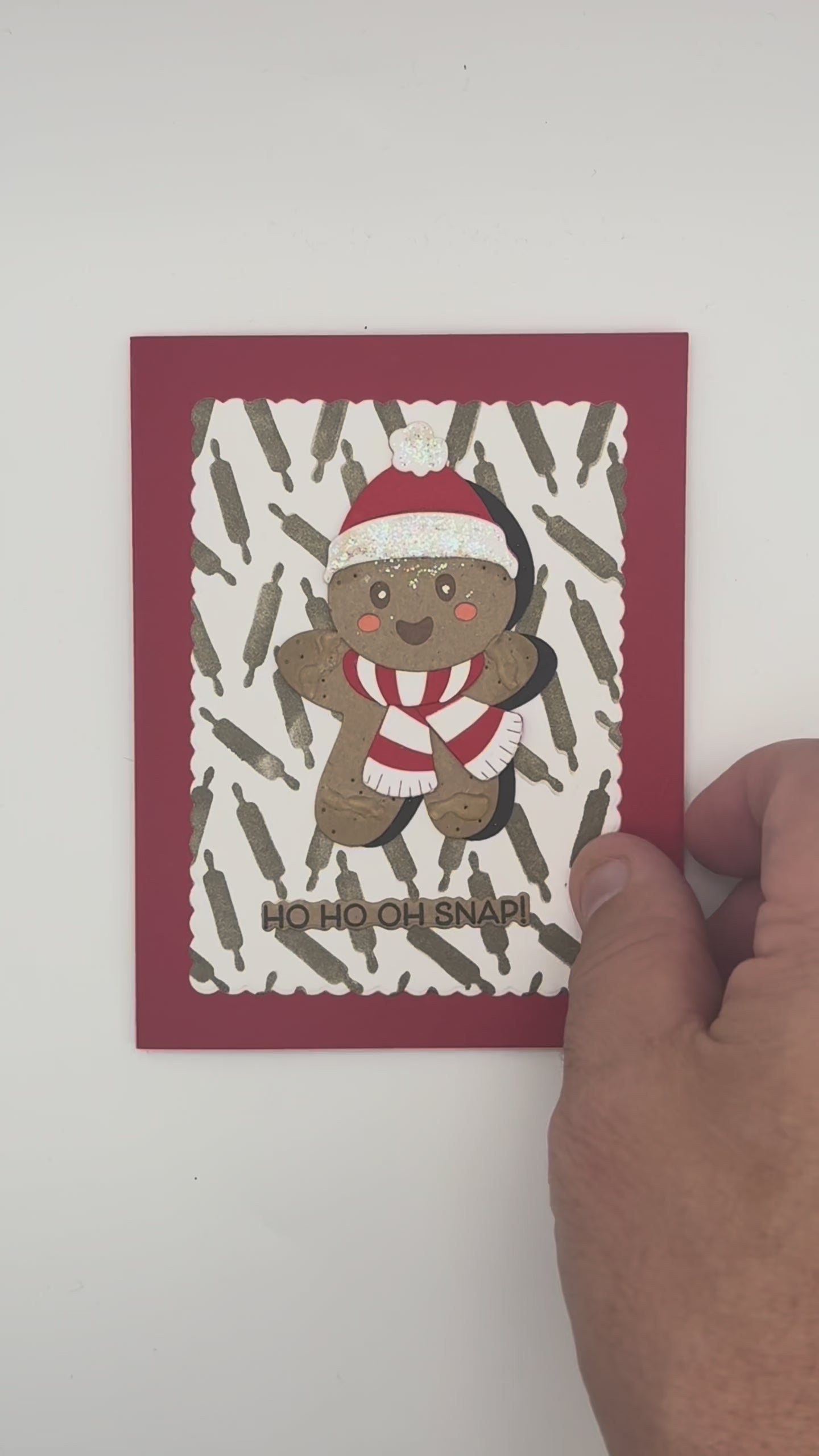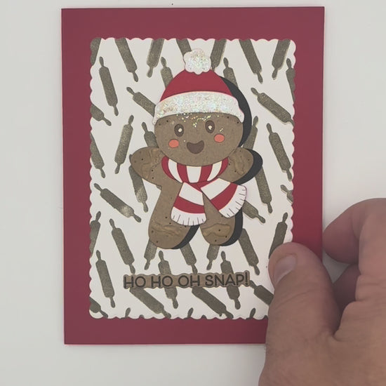 Spread some sweet holiday cheer with a playful twist! This handmade card features an adorable gingerbread cookie character dressed in a festive red hat and scarf, set against a rolling pin patterned background with shimmering accents. The cheeky message “HO HO OH SNAP!” adds a fun touch that’s sure to make anyone smile this Christmas season.